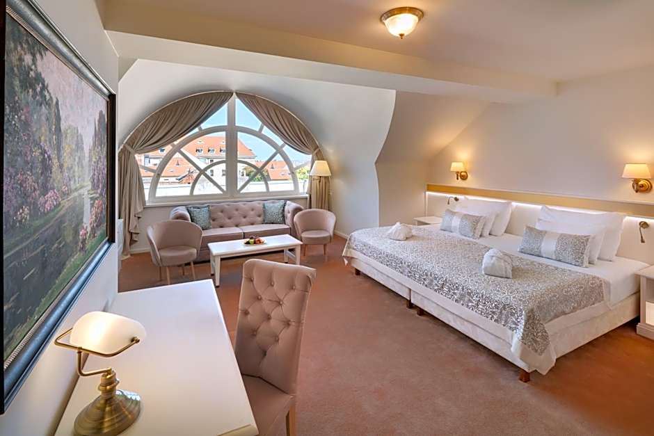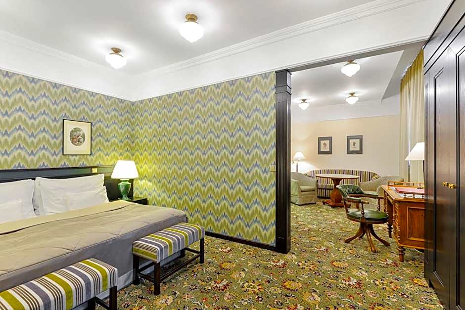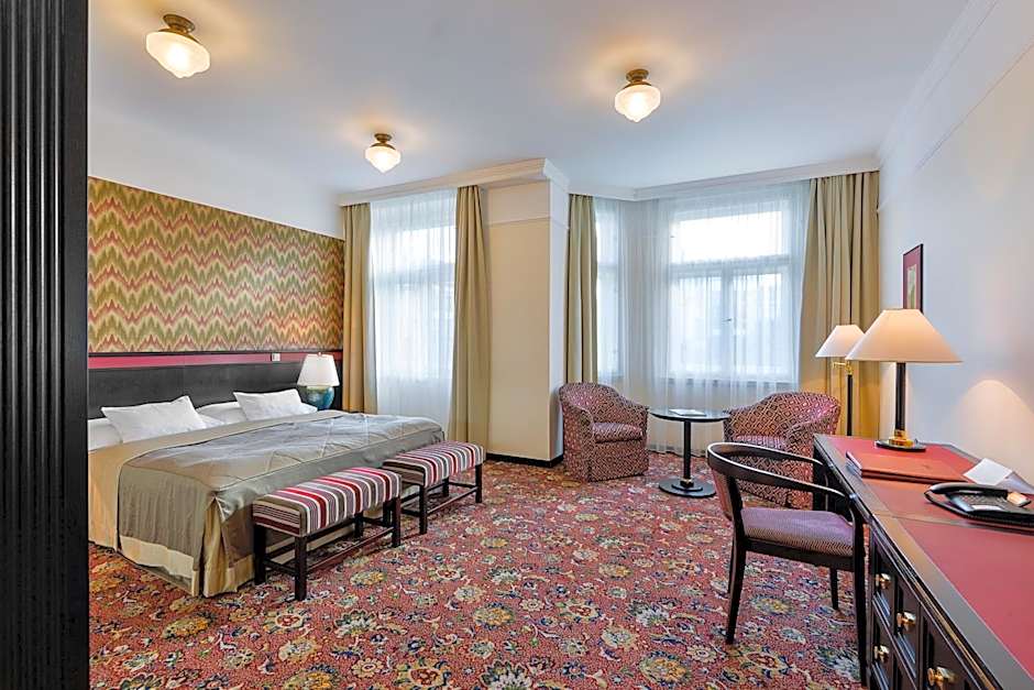 Booking a Superior Double room, you get a luxurious, spacious, carefully designed and elegantly furnished room with exquisite dark wooden furniture. The room is equipped with a safety box and a flat TV with hotel and foreign channels. Comfortable seating table is just perfect for tranquil reading or planning trips to discover beauties of Prague. Spacious and marble bathroom is fitted with heated floor, bath, shower and hair dryer. Accommodations in the room category includes bathrobes and slippers. For guests’ greater comfort, the room is newly refurbished with a kitchenette featuring a mini fridge, electric kettle, Nespresso coffee machine and tea set. An extra bed can be placed to this room. Some Superior rooms can be connected providing a convenient stay for families.