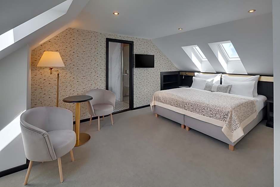 This attractively decorated suite combines elegance and comfort, with every detail thoughtfully designed. The suite includes a spacious seating area and a bedroom, offering a welcoming, home-like atmosphere filled with natural light. Guests can enjoy a luxurious bathroom equipped with a shower, bathtub and upgraded bathroom amenities. Bathrobes and slippers upon arrival are included in the accommodations. The suite also features a mini-bar, kettle, Nespresso coffee machine, and tea set. A comfortable desk is ideal for business travelers. As a special touch, a welcome surprise is included with your stay.