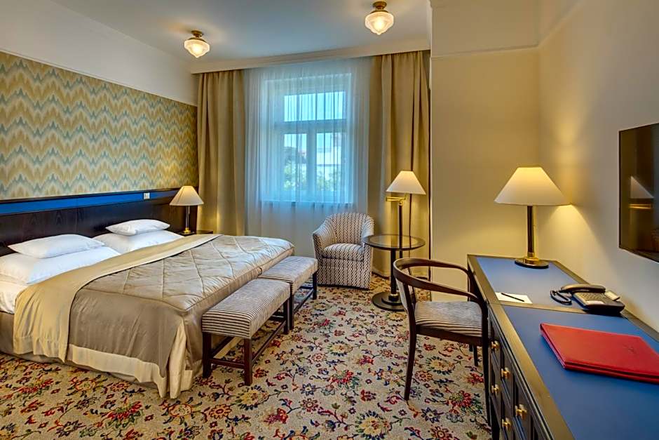 The Deluxe Double Room in the Hotel Savoy Prague is spacious and full of light. The unit is designed in bright colors combined with exquisite dark wooden furniture. The room is equipped with a safety box and a flat TV with hotel and foreign channels. The marble and elegant bathroom comes with a heated floor, a bath, a shower, and a hairdryer. For guests’ greater comfort, the room is newly refurbished with a kitchenette featuring a mini fridge, electric kettle, Nespresso coffee machine and a tea set. Some Deluxe Rooms can be connected, providing a comfortable stay for families.